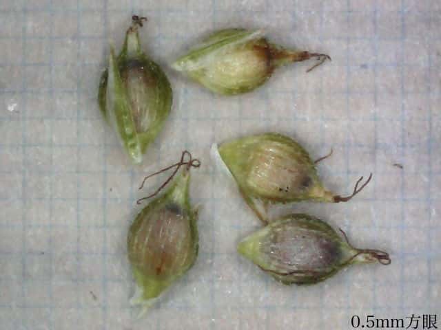 | ▼果胞は長さ約2.4mm、鱗片は1.7mm。 | ▼果胞は長さ約2.3mm、毛が密生する。 | ▼果実は長さ約1.5mm。 |