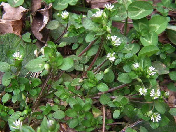 | 越年草 日本全土のいたるところに普通に生える。茎は下部から多く枝を分かち、下部は地につき上部は斜上して高さ10〜20cm、片側に軟毛がある。葉は卵形、鋭頭、長さ1〜2cm、深緑色無毛、下部に少し毛があり、ふちは全縁、時に波状、下部のものは長柄があるが上部のものは無柄。花は集散花序につく。花柄は有毛、花後下向し長さ7〜14mm。萼片は5、楕円形、鈍頭、長さ3〜4mm、ふちは薄膜質、背は有毛。花弁は5、白色、2深裂し萼より少し短い。花柱は3。雄しべは1〜7。果実は卵形、4〜5mm、6裂する。種子は円形、直径1〜1.2mm、半球形の低突起がある。花期は1〜12月。(原色日本植物図鑑) 学名は、Stellaria media ナデシコ科ハコベ属 ミドリハコベ(Stellaria neglecta)は、雄しべは4〜10個。種子にとがった突起がある。茎は緑色。ウシハコベは花柱が5本ある。 似た花の比較 |