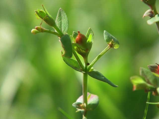 | 1年草ときに多年草 日本全土の水田のあぜや休耕田、野原の湿地などに生える。高さ3〜10(〜35)cm。茎は4稜があり、倒伏してその後立ち上がり、下部からもよく分枝する。ヒメオトギリとは異なり、葉は黄色みをおびた緑色で、質が薄く、開出し、円形〜広卵形〜心形〜卵状広楕円形、長さ2〜7mm、幅2〜8mm、円頭、基部は円形でなかば茎を抱き、無柄。葉身の内側に多数の小さな明点があり、辺縁に腺体はない。花は1〜6花が集散状につき、径5〜8mm、黄色で赤みをおびることがない。苞は葉状で卵状長楕円形。萼片は5個、不等長、長楕円形〜披針形、長さ3mm、幅0.7〜1mm、鋭頭、全縁、明線と明点がある。花弁は5個、長楕円形、長さ2.5mm、鈍頭、腺体はない。雄しべは5〜20個、散在し、葯に明点があるが小さくて目立たない。花柱は2あるいは3個、長さ0.5mm、子房の半分以下。さく果は長卵状、長さ2〜3mm、果皮に腺体がない。種子は淡紫褐色、長さ約0.5mm。初冬に上部の葉腋にムカゴをつける。このムカゴは地上に落下すると発芽して、そのまま冬を過ごす。花期は7〜8月。(日本の野生植物) 学名は、Hypericum laxum オトギリソウ科オトギリソウ属 よく似たヒメオトギリは、雄しべが5〜30個、苞が披針形または線状披針形。 |
