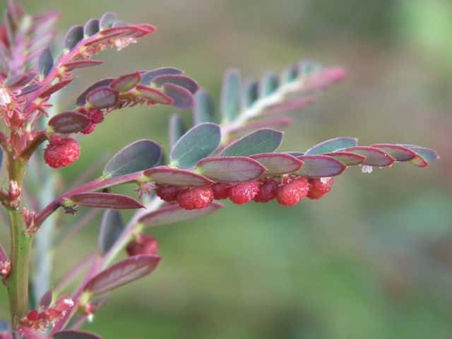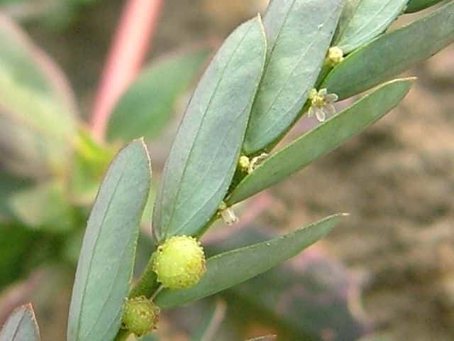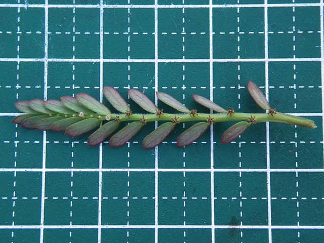 | ▼枝は長さ約5cm、葉が互生に多数つく。 | ▼葉は長さ約8mm。 | ▼葉の縁に小さな毛がある。 |