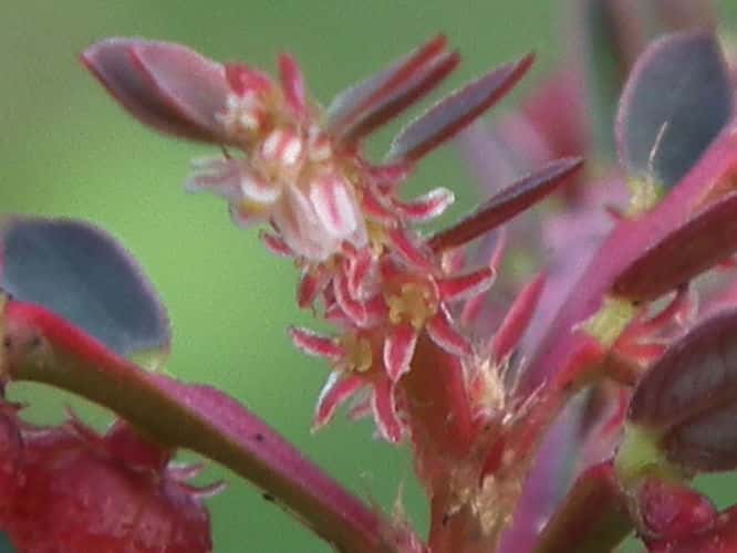 | ▼雌花、萼片は6個。 | ▼柱頭と子房。柱頭は3裂し、更に2裂する。 | ▼雌花は直径約1.5mm。 |