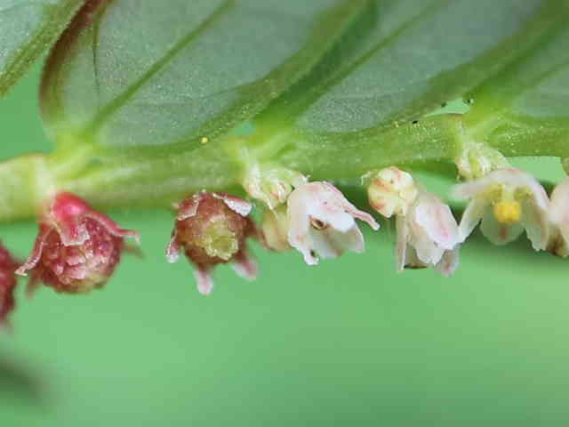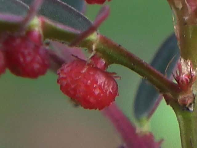 | ▼雄花(左)、果実(中)、雌花(右)。 | ▼果実には短い果柄がある。 | ▼果実は直径約3mm。 |