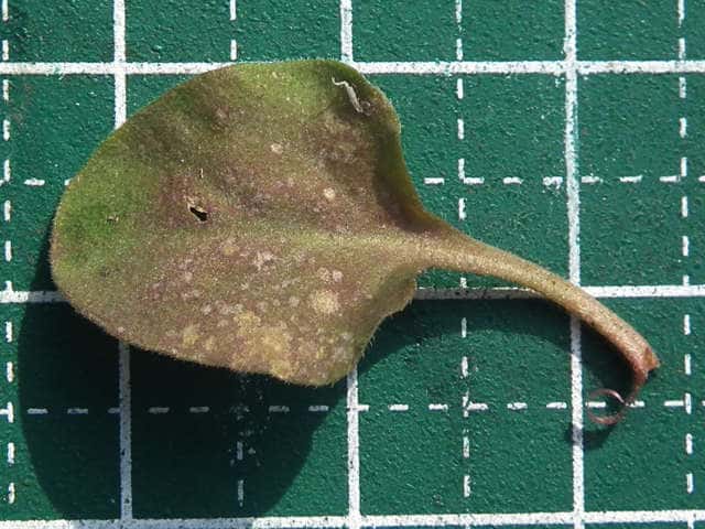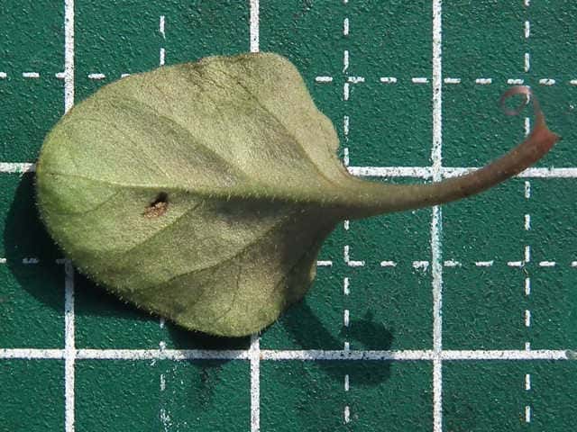 | ▼葉身は長さ約2.4cm、葉柄は長さ約7mm。 | ▼表面や葉柄に毛がある。 | |