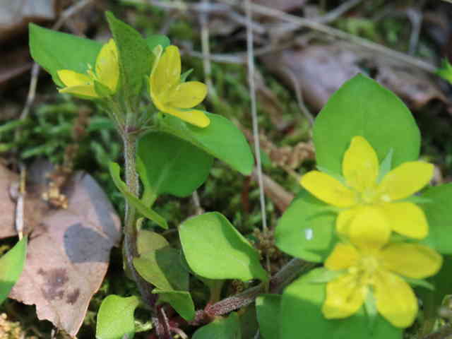 多年草 北海道〜琉球に広く分布し、低地〜山地の道ばたや草原にふつうに見られる。茎は地をはい、まばらに軟毛が生える。葉は対生し、長さ5〜10mmの柄があり、葉身は広卵形で先は短くとがり、基部は円形で、長さ10〜25mm、幅7〜20mm、葉肉内にやや透明な腺点がある。葉腋に1花をつける。花柄は長さ3〜8mm。萼裂片は線状披針形で先は鋭くとがり、透明な腺点がある。花冠は黄色で5裂し、径6〜7mm、裂片は広卵形。さく果は球形でまばらに長毛が生え、径4〜5mm。種子は稜のある楕円形で長さ約1mm、黒色で密にこぶ状突起がある。ときに花柄の長いものをナガエコナスビとして区別することがあるが、朗らかな差異は認めがたい。花期は5〜6月。(日本の野生植物) 学名は、Lysimachia japonica サクラソウ科オカトラノオ属 |