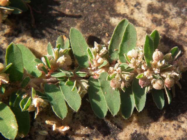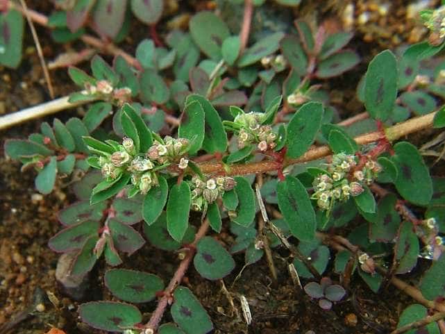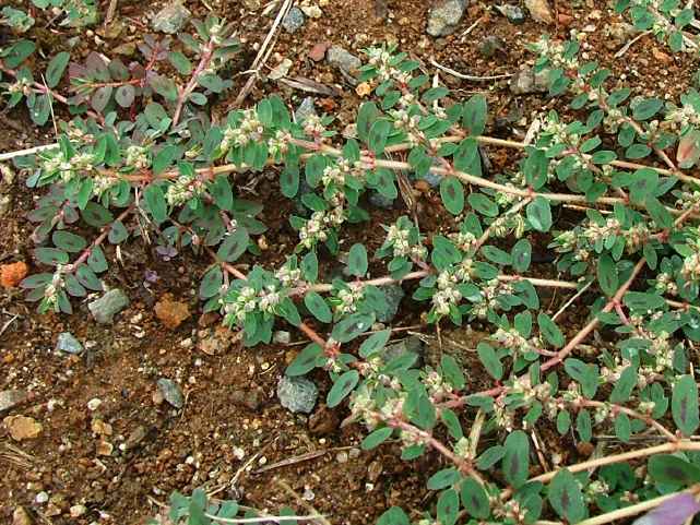 | 1年草 北アメリカ原産。明治中期に渡来し、今では各地の道ばたや畑にふつうに見られ、在来のニシキソウを圧倒している。茎は長さ10〜20cmになり、地を這って広がる。葉は対生し、長さ0.7〜1cmの長楕円形で、表面の暗紫色の斑紋がよく目立つ。基部は左右が非常に不ぞろい。枝の上部の葉腋に汚れた淡紅紫色の杯状花序をつける。さく果には白色の寝た毛が密生する。花期は6〜9月。(野に咲く花) 花は杯状花序であり、苞葉の変化した杯に4個の黄褐色の腺体がつき、その周りに花弁のように見える4個の淡紅色の付属体があり、雄花、雌花は退化して雄しべ、雌しべになっている。雄花4~5個。雌花1個。花柱は3個、先が2裂する。(三河の植物観察) 学名は、Euphorbia maculata トウダイグサ科トウダイグサ属 よく似た仲間にニシキソウがあるが、ニシキソウはさく果に毛がない。 |