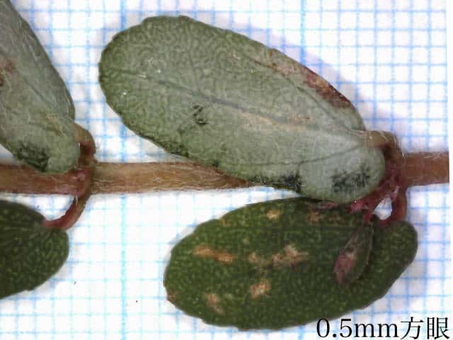 | ▼幼い果実は長さ約1mm。 | ▼葉は長さ約7mm。 | ▼縁に鋸歯があり、基部は左右不相称。 |