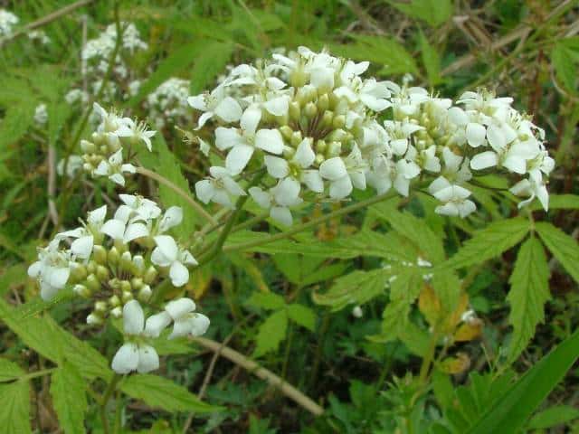 多年草 北海道〜九州の山地の湿った場所や川辺の水湿地に生える。根茎は細長く水平に伸び、分枝して大きな群落をつくる。茎は直立して毛があり、上部は枝を分け、高さ25〜70cm。葉は4〜7個あって長い柄があり、羽状複葉、小葉は5個か7個、長楕円状披針形、長さ4〜10cm、幅1〜3cm、先は鋭尖形、基部はくさび形、縁は不規則な鋸歯があり、両面に毛がある。総状花序は果時に伸びる。萼片は淡緑色、長楕円形で長さ2.5〜3.5mm、背面に毛がある。花弁は白色、倒卵形〜長倒卵形、長さ5〜10mm、雄しべは6個。長角果は線形、長さ1.6〜3cm、幅1〜1.5mm、まばらに毛があるが無毛、果柄は開出または斜上する。種子は褐色で楕円形、長さ約2mm、幅約1mm。花期は4〜7月。(日本の野生植物) 学名は、Cardamine leucantha アブラナ科タネツケバナ属 |