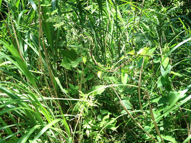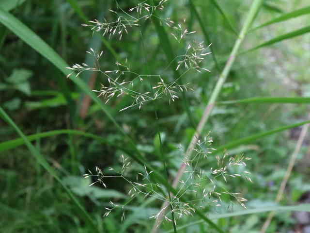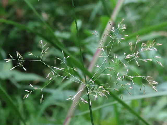 多年草 ヨーロッパ原産。日当たりのよい畑地、道ばた、原野など日本全土に帰化する。茎は細長く高さ50cm〜100cm位あって直立する。葉は線形で先は次第に尖り、長さ5〜20cm、幅は4〜7mm、両面ともざらつき、葉舌は高さ3〜5mmで目立つ。円錐花序は直立し長さ10〜20cm。花序の枝は輪生し、やや密に緑色あるいは紫色を帯びた小穂をつける。小穂は長さ2〜2.5mmで1小花からなる。穎果は紡錘形で淡褐色。種子、地下茎及び匍匐茎で繁殖する。花期は5〜6月。(日本帰化植物写真図鑑) 学名は、Agrostis gigantea イネ科ヌカボ属 |
