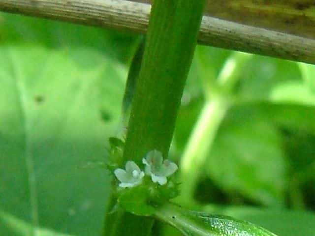 | 多年草 北海道〜九州の湿地に生える。地下茎は横走し、多くの匐枝状の地下茎を伸ばす。茎は高さ10〜60cmになって細かい毛があり、ふつう下部で分枝し、基部から葉を対生する匐枝を伸ばす。葉は菱状狭卵形で長さ3〜6cm、幅1〜2.5cm、鈍頭、縁には粗い鈍鋸歯があり、基部はくさび形で短い葉柄に流れ、光沢はなく、無毛。花は茎の中部以上の葉腋にかたまってつき、小苞は萼よりも短く長さ1〜1.5mm。萼は花時長さ約2mmで、5中裂し、裂片は狭三角形で鋭尖頭。花冠は白色で長さ、径ともに約3mm。分果は長さ約1.2mm、広いくさび形。花期は8〜10月。 茎が直立、分枝しないか少数の短い枝を出す型をコシロネ、茎がさかんに分枝し、枝も茎と同じ高さまで伸びるものをヒメサルダヒコというが、生態型にすぎないと思われる。前者が北地や乾燥気味の場所に多い傾向がある。(日本の野生植物) 学名は、Lycopus cavaleriei シソ科シロネ属 よく似たエゾシロネは萼の裂片の先が三角状になるのみで尖らない。また、ヒメシロネは葉が細く、鋭い鋸歯がある。 |