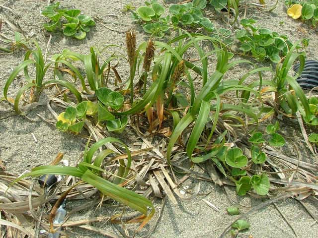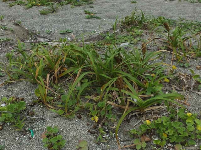 多年草 北海道〜九州の海岸砂浜に生える。全体に剛強で太くて長い根茎がある。基部の鞘は葉身がなく、褐色で繊維状に細裂。葉は幅4〜8mm。有花茎は高さ10〜20cm、稜は鈍い。雌雄異株まれに同株。無柄小穂が多数密集した円柱状の花序をつくり、苞の葉身は目立たない。雌花序は長さ4〜6cm、幅約2.5cm。雄花序は長さ3〜6cm、幅1〜1.5cm。小穂は単性まれに雄雌性。雌花の鱗片は淡黄緑色。果胞は直立または斜上し、長さ約1cm、著しく硬く、縁に不整鋸歯のある挟翼があり、嘴は長く口部は2裂する。柱頭は3岐。果期は4〜5月。(日本のスゲ) 学名は、Carex kobomugi カヤツリグサ科スゲ属コウボウムギ節 |