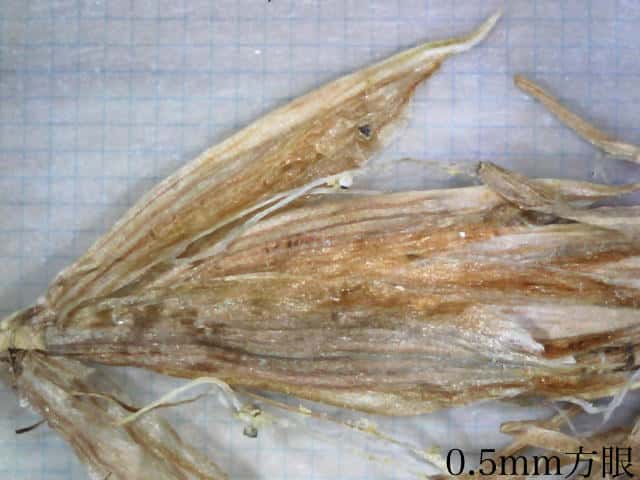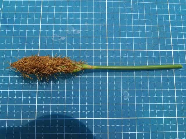 | ▼葉身のない苞の内側に小花が数個ある。 | ▼苞は長さ約2.3cm。 | |