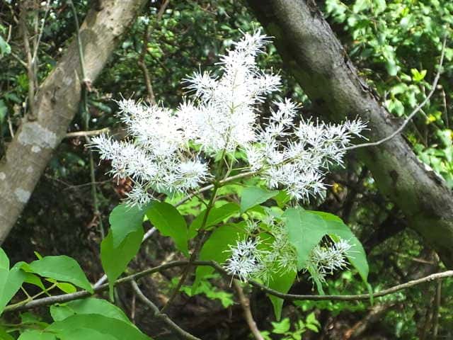 | 落葉高木 北海道〜九州の平地から山地まで、日当たりのよいところにふつうに見られる。高さ5〜15mになる。樹皮は暗灰色。枝は灰褐色。円形の皮目が多い。若い枝には腺毛がある。葉は対生。長さ10〜20cmの奇数羽状複葉。はじめは葉軸と葉柄に微細な毛と短い腺毛がある。小葉はふつう1〜2対、まれに3対あり、長さ5〜10cm、幅1.5〜3.5cmの卵形で、先端はとがり、基部はゆがんだ広いくさび形。裏面の主脈沿いには白い毛がある。雌雄別株。新枝の先に円錐花序を出し、白い花を多数つける。花序には腺毛がある。花冠は4全裂し、裂片は長さ6〜7mmの線形。雄花には2個の雄しべがあり、両性花には雌しべが1個と雄しべが2個ある。果実は翼果。長さ2〜2.7cm、幅4〜5mmの倒披針形。花期は4〜5月。 冬芽の頂芽は長さ4〜6mmの広卵形で、頂生側芽を伴う。芽鱗は1〜2対見え、微細な粉状毛に覆われる。葉痕は半円形。(樹に咲く花) 学名は、Fraxinus sieboldiana モクセイ科トネリコ属 よく似たアラゲアオダモは葉の鋸歯が明瞭。 |