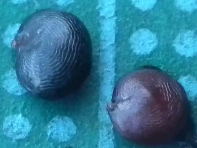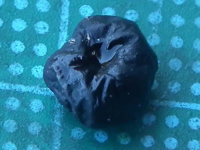 | ▼(少し乾燥した)果実は直径約8.5mm。 | ▼種子は幅約3.5mm、同心円状の溝がある。 | |