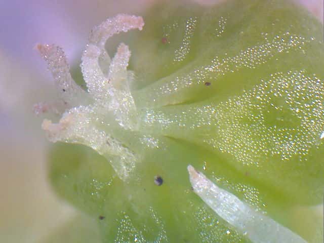 | ▼花は直径約8mm。 | ▼花には花弁はない。 | ▼花の裏面、萼が花弁に見える。 |
