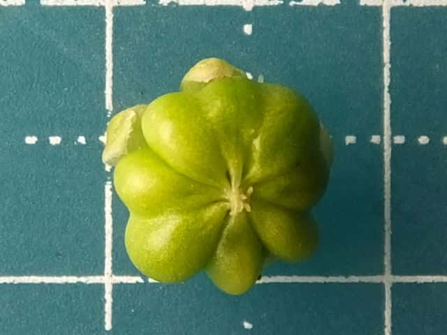 | ▼若い果実。 | ▼心皮は7〜10個で、果実は離生しない。 | ▼果実は直径約7mm。 |