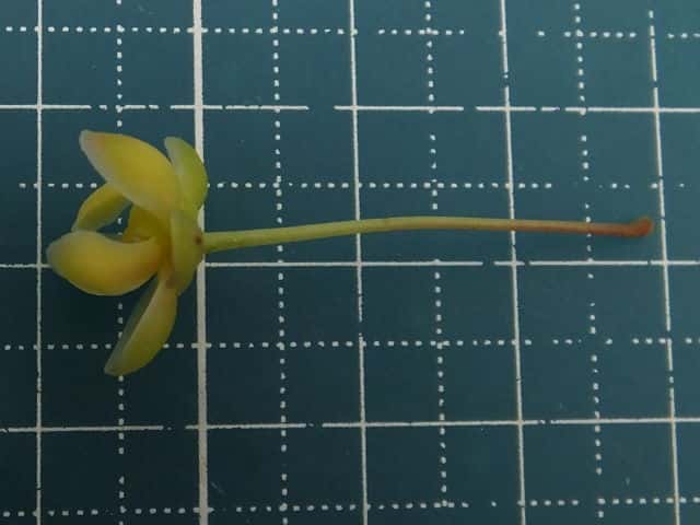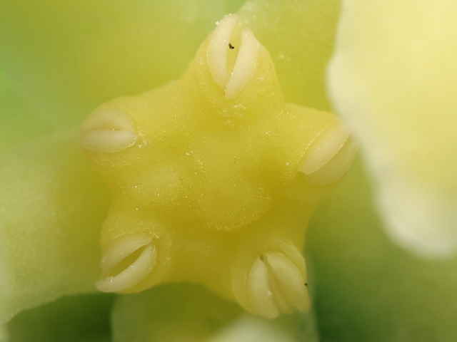 | ▼花は直径約1.5cm、花柄は約3cm。 | ▼雄しべ5個は肥厚して合着する。 | |