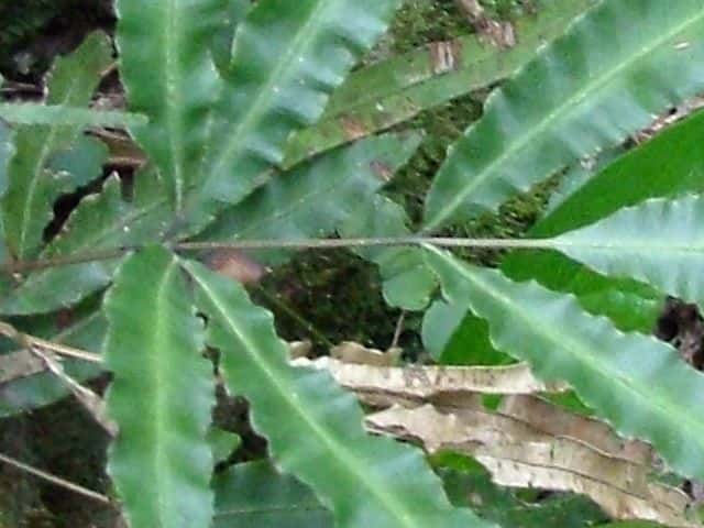 | 常緑多年性シダ植物 房総以西の沿岸部、島根県以西の日本海側、四国、九州の林内に生える。葉柄はわら色で、基部鱗片は褐色。葉身は単羽状葉で1〜3対のやや鎌状に曲った側羽片と頂羽片があり、光沢のある緑色〜濃緑色の革質。羽軸にそってしばしば白斑がはいる。葉は2形。胞子葉は栄養葉より葉柄が長く、葉幅が細い。ソーラスは羽片の辺縁に沿って長くつく。オオバノイノモトソウに似るが、側羽片が1〜3対と少なく、葉が波のようにうねる。 学名は、Pteris nipponica イノモトソウ科イノモトソウ属 |