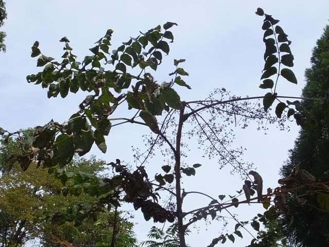 | 落葉低木 北海道〜九州の日当たりのいい山野に生え、高さ3〜5m。刺はないか少ない。刺の多少以外はタラノキと同じ。葉は枝先に集まって互生し、長さ約1mの大形の奇数2回羽状複葉で、葉柄の基部は茎を抱く。小葉は5〜9枚、長さ5〜12cmの卵形で、先はとがり、ふちには不揃いな鋸歯がある。大形の複総状花序に小さな白い花を多数つける。果実は球形で黒く熟す。花期は8〜9月。 冬芽は、円錐形。頂芽は大きく、側芽は小さい。葉痕はV字〜U字形。維管束痕は30〜40個。 学名は、Aralia elata f. subinermis ウコギ科タラノキ属 棘が多いものをタラノキとし、刺のないか少ないものを品種メダラとして区別する考えがある。 葉の形態について、普通図鑑では奇数2回羽状複葉とされるが、タラノキは複数の形式が組み合わさっていて掌状羽状複葉に分類されている。 |