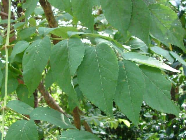 | ▼葉裏は緑白色で脈上に毛が多い、刺はない。 | ▼枝にも刺がない。 | ▼幹にほとんど刺がない。 |