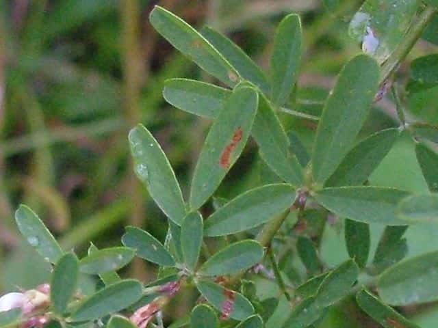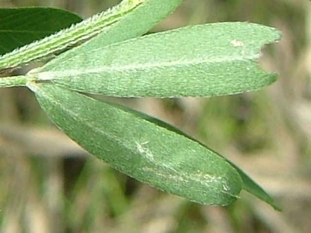 | ▼上部の葉の小葉は長さ約8mm。 | ▼茎には稜があり、伏毛がある。托葉は線形。 | |