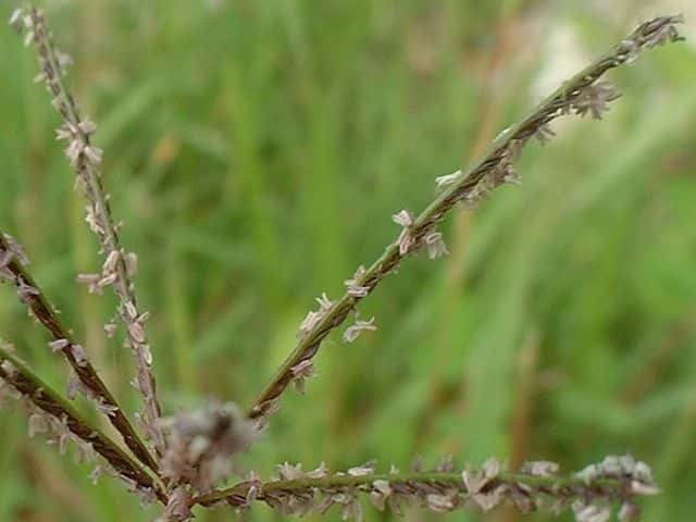 1年草 北海道〜沖縄の畑地や日当たりのよい路傍、空き地などに生育し、群生する。茎は高さ40〜80cm。茎の下部は地表に接して節から根をおろし、上部は斜上する。葉は長さ10〜20cm、幅5〜10mm。裏面にだけ毛があるが、幼苗の葉は両面にある。葉舌は長さ2〜3mm。葉鞘には長い開出毛がある。花序は散房状、長さ5〜15cm、花軸は5〜8個に分かれ翼があり、翼の縁はざらつく。小穂は長さ2.5〜3.5mm。第1苞穎は長さ0.5mm、第2包穎は1.8mm、毛がある。第1小花は護穎だけ、第2小花の護穎と内穎は厚く無毛。果実は乳白色、長さ2mm。花期は8〜9月。(日本イネ科植物図譜) 学名は、Digitaria ciliaris イネ科メヒシバ属 似た花に仲間にアキメヒシバ、コメヒシバがある。 アキメヒシバの中軸には小さな微細突起がある。小穂は卵状楕円形。葉鞘は無毛。 コメヒシバの中軸には微細突起はない。葉舌部にのみ白色長毛。第1苞穎はほとんど退化している。 |