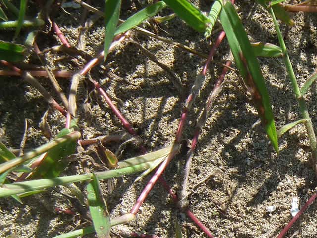 | ▼葉鞘にも長毛がある。 | ▼根元の茎は地を這い節から根を出し増える。 | |