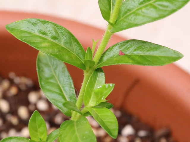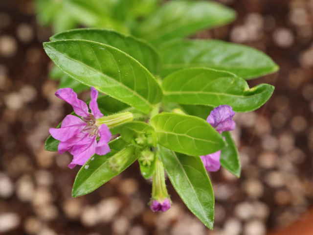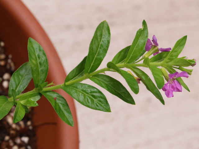 | 常緑小低木 メキシコ〜グアテマラの原産。樹高は50cm程度。茎は一度横に這ってから立ち上がる。茎に軟毛が密生し、 新梢部は緑色~淡紫赤色で充実してくると木化し茶褐色となる。葉は細い楕円形で、長さ10~25mm、幅5mmほどで、先が尖る。葉の表面は濃い緑色で全縁。葉腋から10~15mmの花柄を1または2本出して、径3mmほどの花筒状の先に径10mmほどの花冠をつける。花は6弁花で長さ4~5mmの楕円形で花弁の真ん中が濃い紅紫色をしている。萼筒は稜がある。原産地では周年開花が見られる。果実はさく果。別名クフェア。花期は6〜11月。 ネット上で別名がクサミソハギとされているが、クサミソハギは1年生草本で、同属の別種である。属名のクフェアと呼ばれることからの混乱と思われる。 学名は、Cuphea hyssopifolia ミソハギ科ハナヤナギ属 |