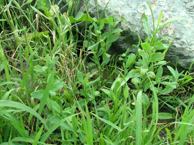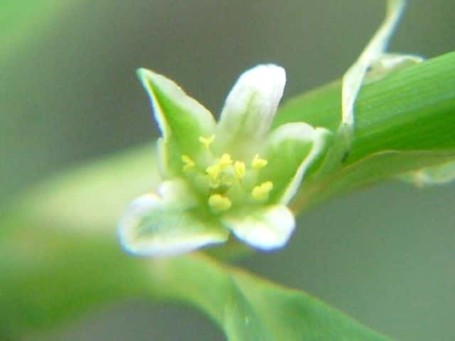 | 1年草 日本全土の道ばたや荒れ地などにふつうに生える。高さ10〜40cm。茎は細い縦筋が目立ち、下部からよく分枝する。葉は互生し、長さ1.5〜3cmの線状披針形。托葉鞘は白色の膜質で、2深裂し、さらに細かく裂ける。花は緑色で葉腋に1〜5個ずつ束生する。花被は長さ2.5〜3mmで5中裂する。花被片のふちは白色または淡紅色を帯びる。そう果は黒褐色で、長さ約3mmの3稜形。花被にほとんど包まれる。花期は5〜10月。(野に咲く花) 学名は、Polygonum aviculare タデ科ミチヤナギ属 痩果が小さいものだけで、花被に包まれ、頭部が見えない。(三河の植物観察) 似た仲間に海岸に生えるアキノミチヤナギがあり、果実の先端が花被からつきでる。 |