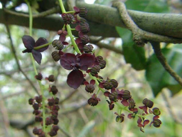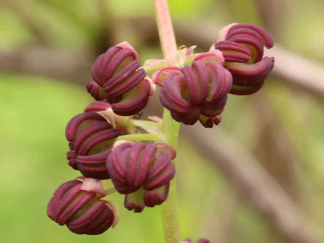 | 落葉つる性木本 北海道〜九州の山野にふつうに生える。ときに葉は越冬する。樹皮は灰黒褐色。円形の皮目がある。つるは右巻き。古いつるには短枝が発達する。葉は互生。古いつるでは短枝に集まってつく。3出複葉で、葉柄は2〜14cm。小葉は長さ2〜6cm、幅1.5〜4cmの卵形。先端は少しへこみ、基部は丸い。縁には大きな波状の鋸歯がある。雌雄同株。葉腋から総状花序が斜めに垂れ下がり、濃紫色の花をつける。花には花弁はなく、花弁状の萼片が3個ある。花序の先端には雄花が10数個。基部側に大型の雌花が1〜3個つく。雄花は直径4〜5mm、花柄は長さ約3mm、雄しべは6個。雌花は直径約1.5cm、花柄は長さ2〜4cm、円柱形の雌しべが3〜6個ある。果実は液果。長さ約10cmの長楕円形で、10月に熟す。熟すと紫色を帯び、裂開する。種子は黒褐色、長さ4〜5mm。花期は4〜5月。 冬芽は長さ2〜4mmの卵形。芽鱗は12〜16個ある。葉痕は半円形。(樹に咲く花) 学名は、Akebia trifoliata アケビ科アケビ属 |
