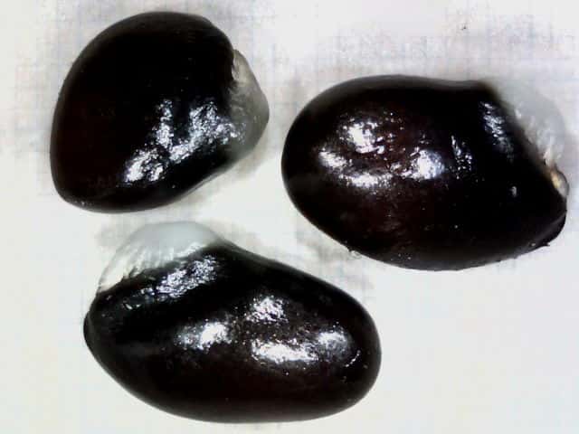 | ▼果肉に包まれて種子が多数並んでいる。 | ▼種子は5.5〜6.5mm。 | ▼種子には種枕がついている。 |