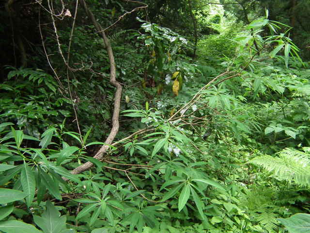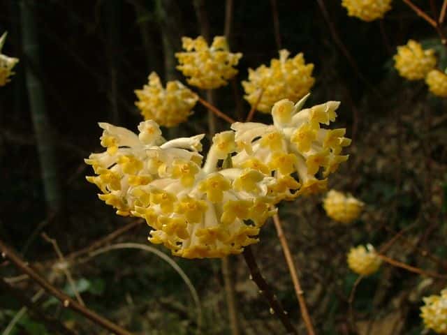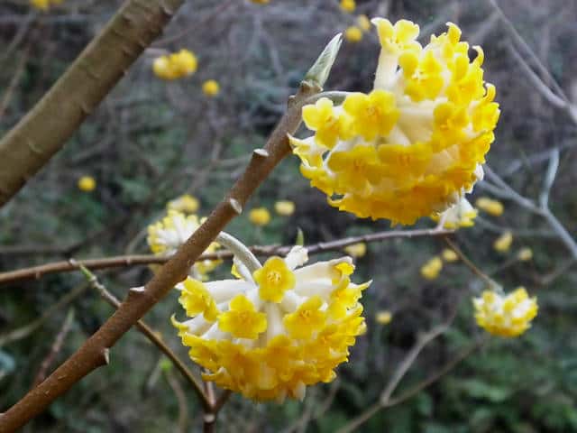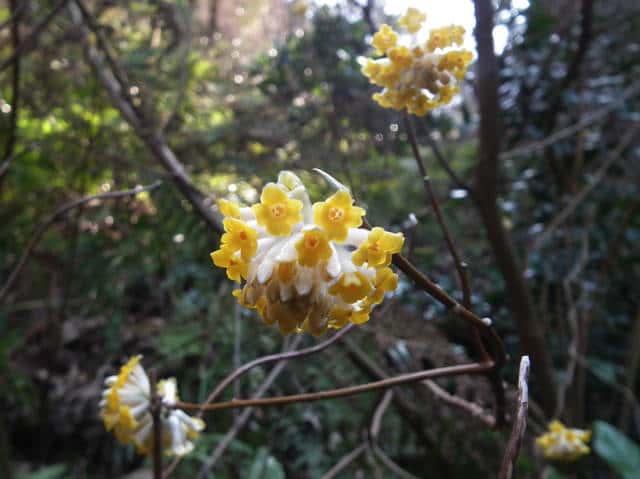 | 落葉低木 中国〜ヒマラヤ原産。林内に野生化したものも多い。高さ2mほどになる。よく分枝して、半球形の樹形をつくる。樹皮は灰色で縦の筋がある。本年枝は必ず三つ又になってでる。黄褐色ではじめ伏毛がある。葉は互生。葉身は長さ5〜20cm、幅2〜5cmの長楕円形または披針形。先は鋭形、基部は長いくさび形。ふちは全縁。両面に絹毛があり、とくに裏面に多い。葉柄は長さ5〜10mm。葉の展開前に開花する。枝先の頭状花序に小さな花が30〜50個つく。花は両性で、花弁はなく、萼が目立つ。萼筒は長さ8〜15mm、先は4裂する。萼片の内面は鮮黄色、外面には絹毛が密生する。雄しべは8個で、4個が萼筒の口部から見える。果実は核果。6〜7月に熟し、緑色で有毛。萼筒が宿存して周りを包む。種子のように見えるのは堅い内果皮に包まれた核。核は紡錘形で長さ4〜5mm。中に種子が1個ある。花期は3〜4月。 冬芽は裸芽で、銀白色の絹毛におおわれている。花芽は大きく、長い柄がある。はじめ総苞があるが、冬のうちに落ちてしまう。葉痕は円形または半円形、つきでて上を向く。維管束痕は1個。(樹に咲く花) 学名は、Edgeworthia chrysantha ジンチョウゲ科ミツマタ属 |
