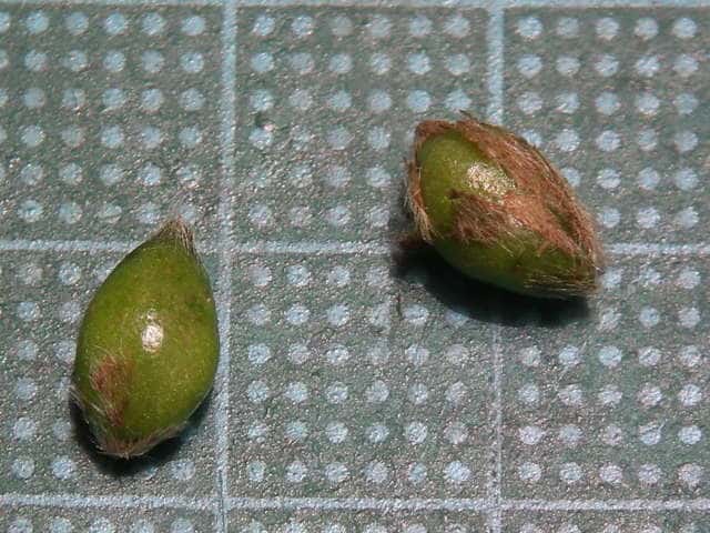 | ▼果実には毛がある。 | ▼果実の中に1個の核がある。 | ▼核は紡錘形で、長さ約5mm。 |