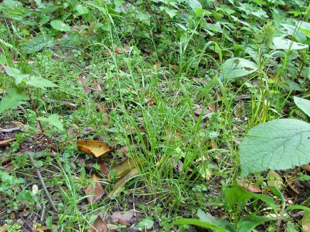 1年草または越年草 北海道〜九州の路傍や溝のふちなどの湿地、低山の木陰などに生育する。茎はまばらに叢生し、下部で節から曲がり、上部は直立、全体が緑色で軟弱。茎の高さ40〜60cm。葉は長さ10〜15cm、幅2〜6mm、線形で先は次第にとがり、質は薄く、多少ざらつく。葉舌は長さ1.5〜3mm、鈍頭細裂。葉鞘は平滑。花序は円錐形、長さ20cm内外。枝は糸状で下垂し、各節から2本出て離れ、その上半分に小穂をつける。小穂は卵形、長さ3〜4mm、4〜6小花からなる。第1包穎は卵状披針形、長さ1.5〜1.8mm。第2包穎はやや長い。護穎は長さ2.5mm、5脈。穎の下半部には短毛が多い。内穎は護穎よりも短く、竜骨に長毛。護穎は熟すると穎果を包んだまま脱落しやすい。花期は5〜6月。(日本イネ科植物図譜) 学名は、Poa acroleuca イネ科イチゴツナギ属 |