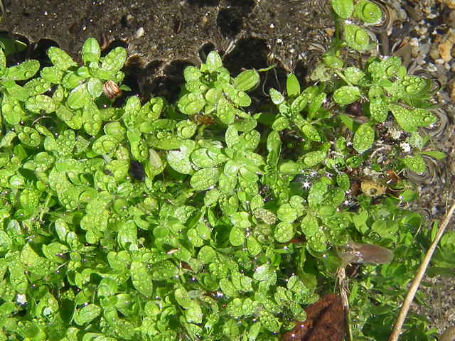 | 1年草または多年草 北海道〜沖縄の湖沼やため池、河川、水路、水田などに生育する沈水〜浮葉〜湿生植物。湧水域と冬も水のある湿田には特に多い。茎は盛んに分枝して伸び、水中で明るい緑白色のパッチをなす。葉は対生で葉柄はない。葉形は顕著な変異を示すが、少なくとも茎の下部の沈水葉は線形で長さ7〜20mm、幅0.5〜1.5mm、1脈で先端は凹形。茎の上部の葉ほど幅が広くなり、浮葉はへら形〜卵状楕円形で長さ6〜15mm、幅3〜6mm、3(〜5)脈。雌雄同株で葉腋に雄花と雌花が各1〜2個並んでつく。雄花は1個の雄しべ、雌花は1個の雌しべからなる。水面上の花は風媒、水中では水媒のほか、花粉管が組織内を雌花に向かって伸びる内性隣花受粉も知られる。果実は4分果からなり偏平、倒卵状楕円形で軍配のような形をしている。本種をミズハコベ、ナンゴクミズハコベ、マンシュウミズハコベの3変種に細分する見解がある。花期は通年。(日本の水草) 学名は、Callitriche palustris オオバコ科アワゴケ属 参考 中国植物誌 よく似たものに帰化植物のイケノミズハコベ(Callitriche stagnalis)がある。やや大型で3〜5本の葉脈があり、水面の葉と水中葉とが同形。果実は長さ幅とも約1.8mmの円形。 |