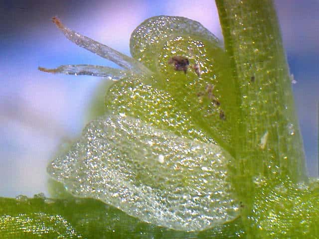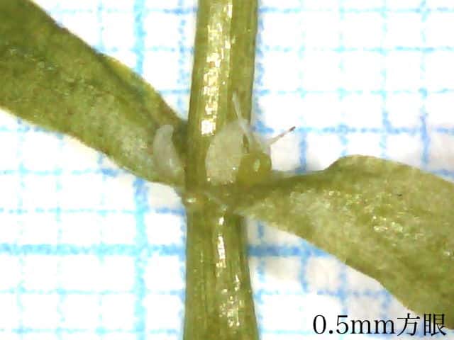 | ▼水中で葉腋につく雌花。子房の長さ約0.5mm。 | ▼茎を除いてある。雌花の脇に雄しべがある。 | ▼長い花柱を伸ばす雌花。 |
