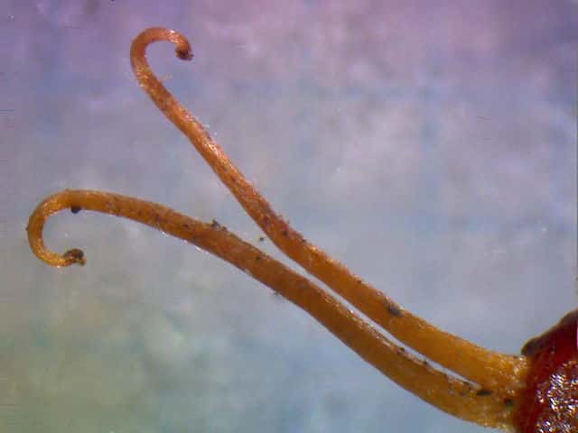 | ▼枯れた花被に包まれた果実、長さ約3mm。 | ▼果実には先が曲がった花柱が残る。 | |
