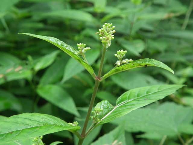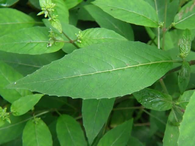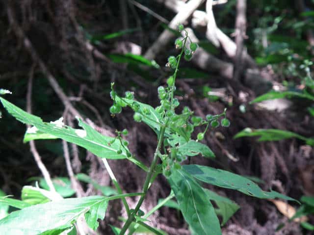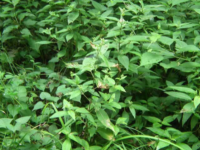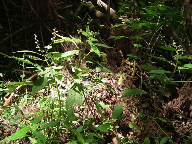 | 多年草 北海道〜九州の山野の木陰などに生える。高さ20〜60cm。茎には下向きの毛が生え、節は赤褐色を帯びることが多い。葉は対生し、長さ5〜13cm、幅1.5〜4cmの長卵形〜卵状長楕円形で先端はとがり、ふちには浅い鋸歯がある。茎の先や上部の葉腋から花序をだし、白色または淡紅色の小さな花をつける。花弁は2個で2裂する。堅果は直径3〜4mmの広倒卵形で、カギ状に曲がった毛が密生する。花期は8〜9月。(野に咲く花) 茎や葉は通常細毛がある。花序の軸は無毛またはやや腺毛がまばらに生える。果実は広倒卵形で幅3〜4mm、溝があり、かぎ状の毛がある。2室で2種子がある。(原色日本植物図鑑) 学名は、Circaea mollis アカバナ科ミズタマソウ属 似た花にウシタキソウ(Circaea cordata)がある。葉はハート型で細毛があり、節部は紅紫色にならない。 |