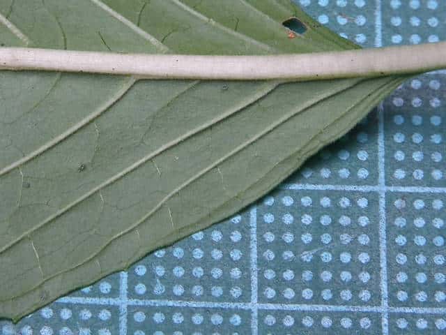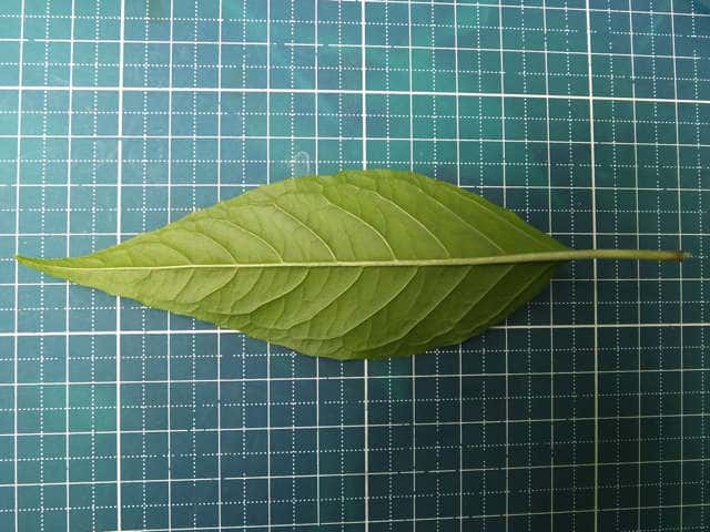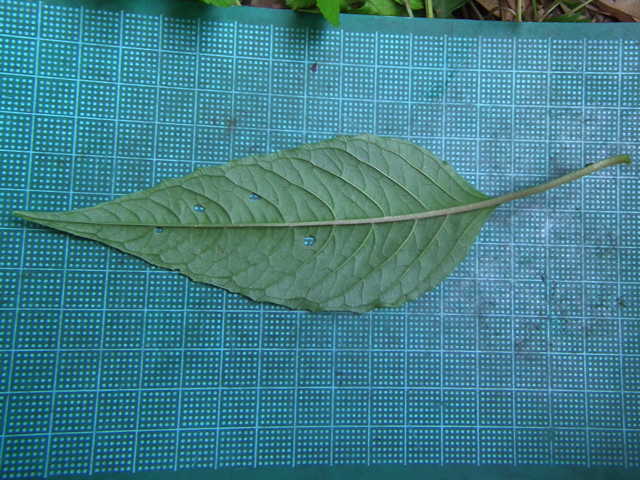 | ▼葉身は長さ約13cm、基部は円形〜くさび形。 | ▼葉脈は裏面に突出する。 | ▼葉は対生するが、ずれるもの(上)がある。 |