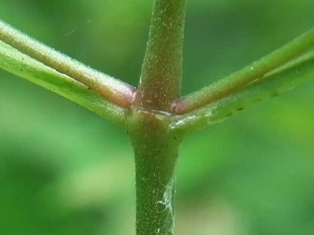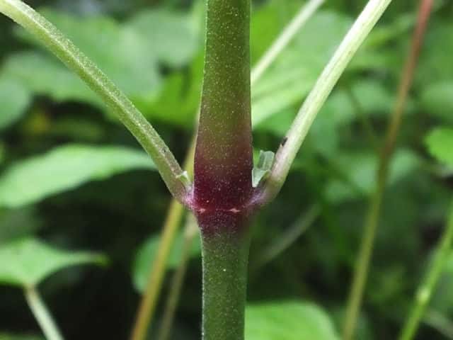 | ▼節は赤褐色を帯び、茎や葉柄に微毛がある。 | ||