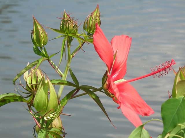 | 多年草 北米原産の高さ2mを越える大型の多年草。葉は深く3〜5の掌状に裂ける。萼は5深裂し卵状被針形で、その外側に多数の細長い小苞葉がつく。花は直径10〜20cm、花弁は狭卵形で深紅色、平開する。雌しべと雄しべは途中まで合着して柱状となり、長くて超出する。雌しべの柱頭は5つに分かれ、その下に雄しべが多数つく。花期は8〜9月 学名は、Hibiscus coccineus アオイ科フヨウ属 |