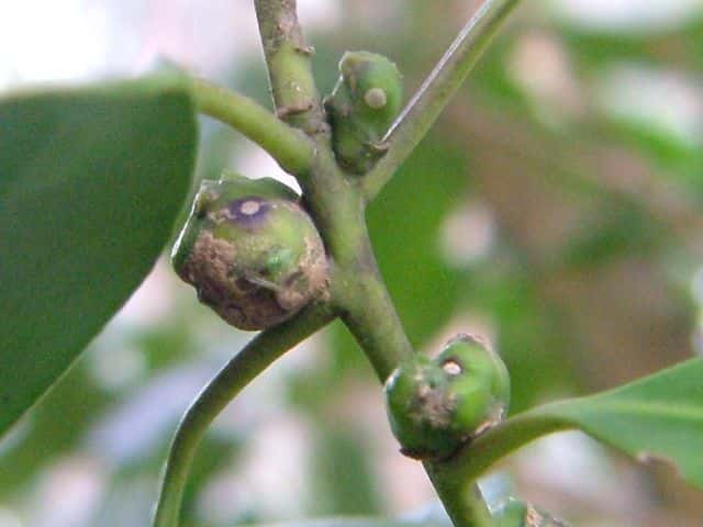 | ▼葉の裏面。 | ▼虫えい(モチノキメタマフシ) | |