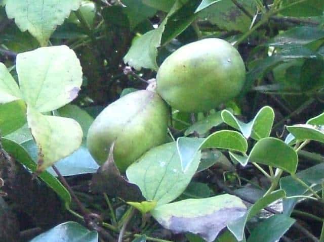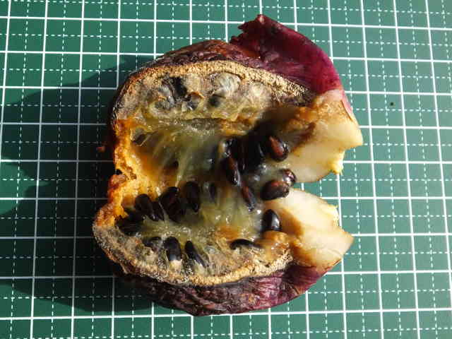 | ▼果実は長さ約7cm。 | ▼果肉には種子が多数入っている。 | |