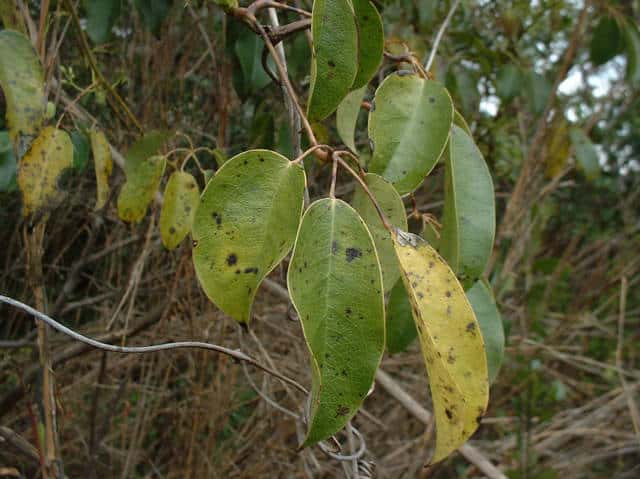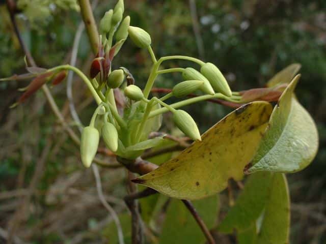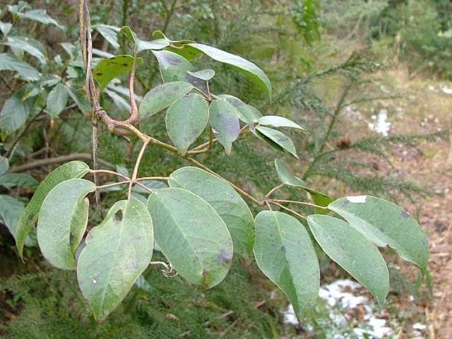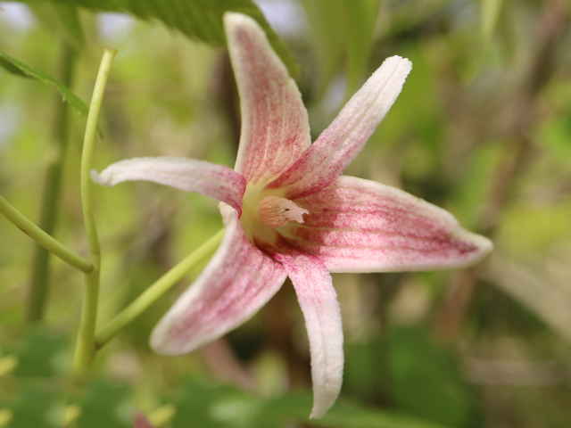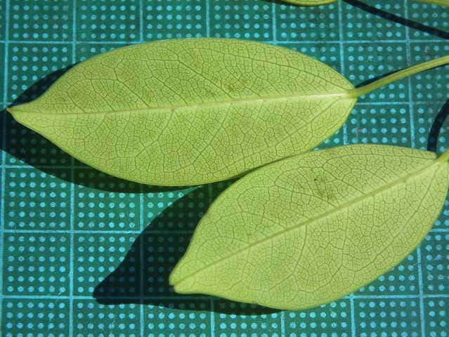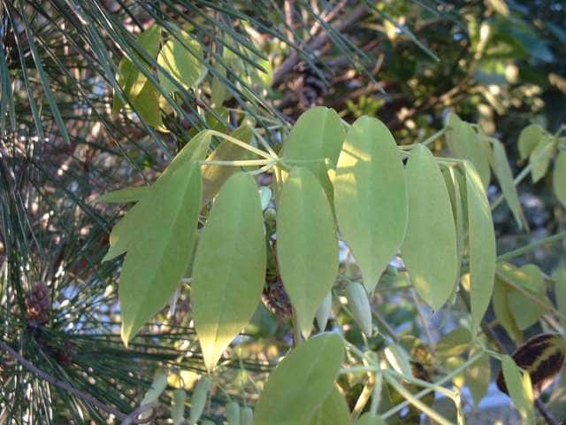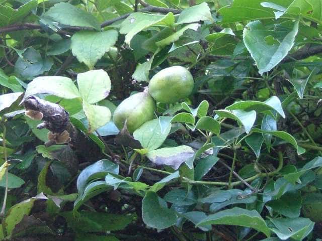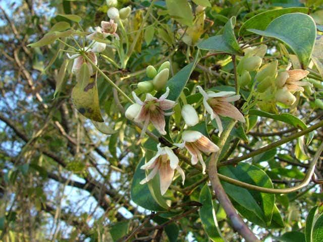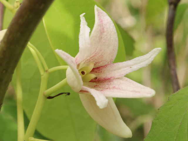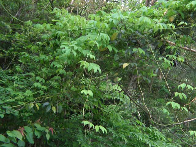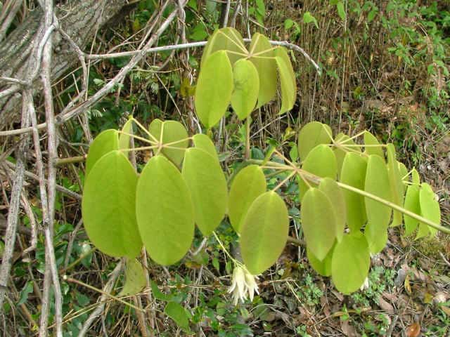 | 常緑つる性木本 関東地方南部以西〜沖縄の海岸の常緑樹林内や林縁に生える。つるの太さは直径8cmくらいになる。樹皮は暗緑色と灰白色のまだら模様になる。若い枝は無毛で、暗緑色または暗紫褐色。葉は互生。掌状複葉で、小葉が5〜7個ある。小葉は長さ5〜10cm、幅2〜4cmの楕円形。先端は短く尖り、基部はややまるい。ふちは全縁。革質で、表面は光沢がある。裏面は淡緑色で、細かい網状脈が目立つ。小葉の柄は長さ1〜4cm。雌雄同株。葉腋から短い総状花序をだし、淡黄色の花を3〜7個つける。花は下向きに咲き、内面には単紅紫色の筋がある。花には花弁はなく、花弁状の萼片が6個、2列に並ぶ。外側の3個は披針形で長さ1.3〜2cm、内側の3個は線形。雄花の外側の萼片は内側の萼片より短い。雄花には合着した6個の雄しべがある。雌花は外側の萼片のほうが内側の萼片より長く、雌しべが3個ある。果実は液果。長さ5〜8cmの卵円形、10〜11月に紫色に熟す。果肉は白く、長さ5〜8mmの黒色の種子が多数ある。アケビと違って裂開しない。花期は4〜5月。 冬芽は、長さ6〜8mmの円錐形。芽鱗は10〜16個ある。葉痕は半円形、維管束痕は多数ある。(樹に咲く花) 学名は、Stauntonia hexaphylla アケビ科ムベ属 花の色は白色、緑白色、淡黄色、淡紅紫色まである。 |
