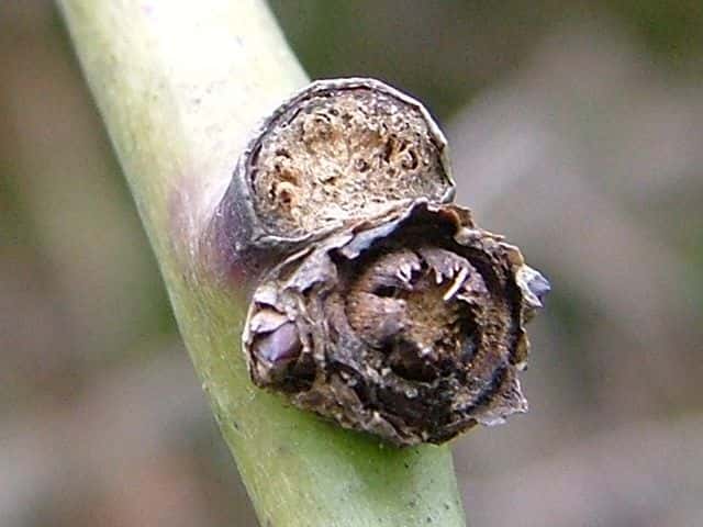 | ▼2017年11月25日 果実 枕木 | ▼果実は裂開しないとされるが、果期を過ぎると小さく割れるようだ。 | |