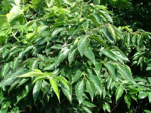| 落葉高木 関東地方以西〜沖縄の丘陵の日当たりの良いところに生える。高さ15〜20m、直径1mほどになる。樹皮は灰褐色でなめらか。老木になると鱗片状にはがれ、基部は板根状に広がる。本年枝は細く、円形の皮目が多い。葉は互生。葉身は長さ4〜10cm、幅2〜6cmの長楕円形。両面とも短い伏毛があって、著しくざらつく。先端はふつう尾状に長くとがり、基部は広いくさび形か丸く、左右不対象。基部から3本の脈が伸びている。縁には鋭い鋸歯がある。側脈は鋸歯の先端へ達する。葉柄は長さ約1cm。雌雄同株。葉の展開と同時に開花する。雄花は新枝の下部に集まってつき、雌花は上部の葉のわきに1〜2個つく。雄花の花被片は5個。長さ2mmほどの楕円形。雄しべは5個。雌花の花被は長さ2〜3mmの筒形。花柱は2裂し、柱頭に白い毛が密生する。果実は核果。直径7〜12mmの球形で、10月に紫黒色から黒色に成熟する。果肉は美味。干し柿に似た味で甘い。花期は4〜5月。 冬芽は長さ4〜6mmのやや扁平な長卵形。芽鱗は6〜10個。葉痕は三角形。(樹に咲く花) 学名は、Aphananthe aspera アサ科ムクノキ属 |