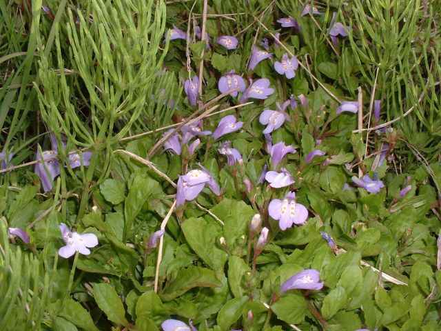 | 多年草 本州〜九州のやや湿気のある田のあぜなどに生える。葉は根ぎわに集まり、その間から匍匐茎を伸ばして新苗をつくって繁殖する。根ぎわの葉は倒卵形で基部は柄となり、縁にはふぞろいに裂けた鋸歯があり、長さ2〜5cm、幅1.5〜2cm。匍匐茎の葉は倒卵形または円形で小さく、無柄。根ぎわの葉の間から花茎を伸ばしてまばらに少数の花をつけ、高さ10〜15cm。萼は鐘形で半ばまで5裂し、無毛またはまばらに腺毛が生える。花冠は紅紫色で長さ1.5〜2cm、上唇は下唇よりやや短く、狭卵形で深く2裂。下唇は3裂し、中央部は隆起して黄色となり赤褐色の斑紋がある。さく果は扁球形で、萼に包まれる。花期は4〜5月。 白花品をシロバナサギゴケまたはサギシバとよび、紅紫色のものをサギゴケまたはムラサキサギゴケとよんで区別することがある。(日本の野生植物) 学名は、Mazus miquelii サギゴケ科サギゴケ属 よく似た花にトキワハゼがあるが、花が小さく横に這う枝を出さない。 |