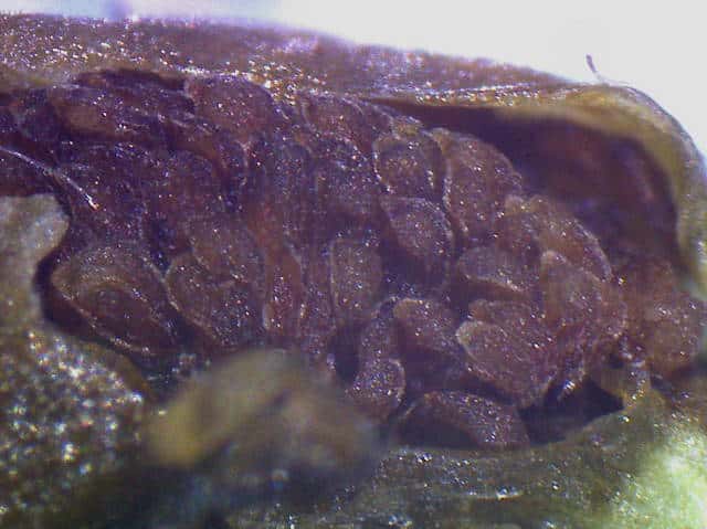 | ▼果実の中に種子が多数入る。 | ▼未熟な種子。 | ▼未熟な種子は長さ約0.1mm。 |