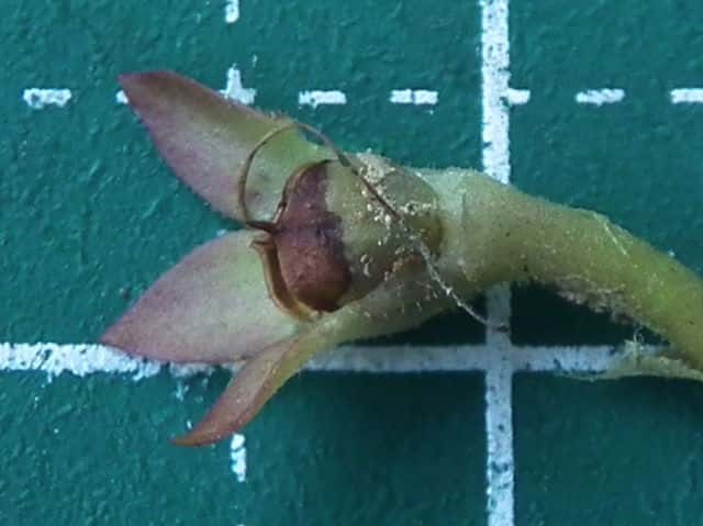| ▼花は長さ約1.5cm。 | ▼幅は約1.5cm。 | ▼上唇の先がはっきり2裂する。 |