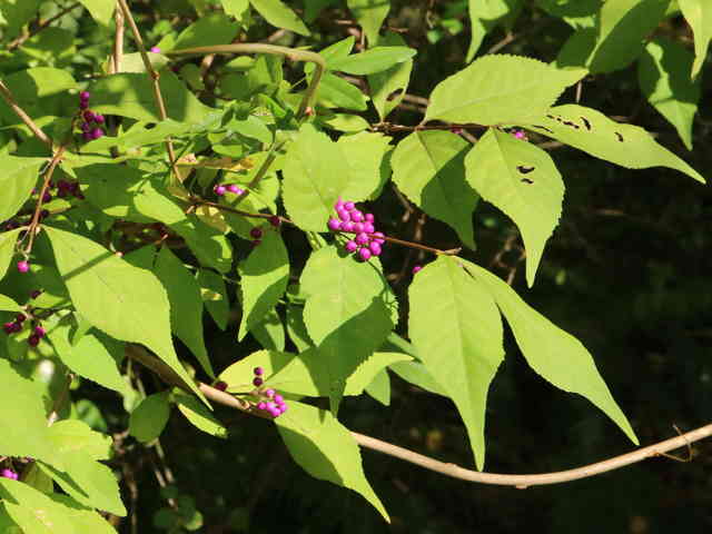 | 落葉低木 北海道〜沖縄の山野の林内や林縁に生える。高さ3mほどになる。樹皮は灰褐色。枝は灰褐色。はじめ細かい星状毛があるが、のちに無毛。皮目は楕円形でやや多い。葉は対生。葉身は長さ6〜13cm、幅2.5〜6cmの長楕円形。先は尾状に尖り、基部は狭いくさび形。縁には細かい鋸歯がある。両面とも無毛。裏面には淡褐色の腺点が散在する。葉柄は長さ2〜7mm。葉腋から集散花序を出し、淡紅紫色の花をつける。花冠は長さ3〜5mm、上部は4裂し、裂片は平開する。雄しべ4個、雌しべ1個。果実は核果。直径3mmほどの球形で、紫色に熟す。核は長さ約2mm。花期は6〜8月。 冬芽は裸芽。頂芽は長さ1〜1.4cm、側芽は長さ5〜10mmの紡錘形で、ともに長さ2〜5mmの柄がある。葉痕は円形〜半円形、維管束痕は1個で突出する。(樹に咲く花) 学名は、Callicarpa japonica シソ科ムラサキシキブ属 よく似た仲間にヤブムラサキやコムラサキがある。またヤブムラサキとの雑種にイヌムラサキシキブがあり、葉の裏面に星状毛が残る。 ムラサキシキブ・・・葉の鋸歯はほぼ全体。花序は腋生かわずかに上から出る。 コムラサキ・・・・・葉の鋸歯は上方のみ。花序は葉腋より少し上から出る。 |