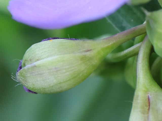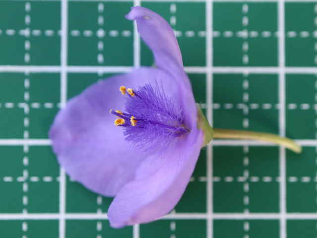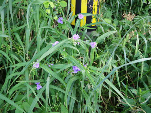 1年草 北アメリカ東部原産。 [三河の野草] 道端や空き地に野生化している。高さ15〜115cm。葉は長さ5〜45cm、幅0.4〜4.5cm、粉白色。葉の気孔が大きく、よく気孔観察に使われる。萼片は3個、粉白を帯び、無毛又は先端に毛があり、長さ4〜15mm。花弁は3個、長さ0.8〜2cm、広卵形、青色〜バラ色、稀に白色。雄しべ6個、花糸が紫色、下部に単細胞幅の細い毛が密生する。さく果は長さ4〜6mm。種子は長さ2〜3mm。花期は6〜9月。 学名は、Tradescantia ohiensis ツユクサ科ムラサキツユクサ属 似た花のオオムラサキツユクサは草丈約5〜35cm、萼片に毛がある。 |